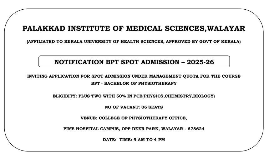 Palakkad Institute Of Medical Sciences Physiotherapy college, Run by V.N Public and Educational Trust, and located in the picturesque setting of Walayar, Palakkad at NH-544 With the majestic Green Corridor mountain range as our backdrop, we offer an educational experience that’s as breathtaking as our views Our college is committed to providing excellence in teaching and instilling professional values in the field of physiotherapy.